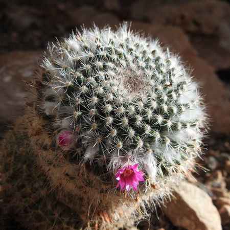 El área seca incluye cuatro cuadros centrales con diferentes especies agrupadas según su origen geográfico. Aquí encontramos plantas propias de los desiertos de América (cactáceas y otras suculentas, en sendos parterres), África (aloes, kalanchoes, euforbias…) y de las zonas más áridas de las Islas Canarias, representadas con dragos (Dracaena draco), bejeques (Aeonium), verodes (Kleinia neriifolia), cardones (Euphorbia canariensis), cardoncillos (Ceropegia fusca, C. dichotoma), tajinaste blanco (Echium decaisnei)... En general, muchas de las plantas que se localizan en esta sección del invernadero cuentan con tejidos y órganos de reserva de agua, como adaptación a la aridez de los ambientes donde viven.