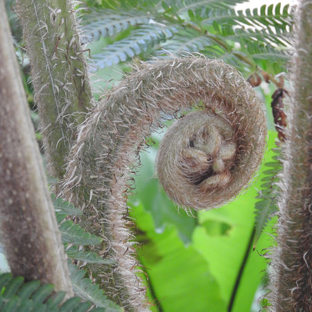 En uno de los cuadros centrales, encontramos una interesante colección de helechos, incluyendo especies arborescentes, plantas sin flores ni semillas que poblaron y dominaron la vegetación del planeta durante el paleozoico (hace 290 millones de años). En otro cuadro se muestran las gimnospermas más antiguas (surgidas hace unos 280 millones de años), las primeras plantas productoras de semillas en la historia de la vida en la Tierra: las cícadas, fósiles vivientes, con representantes como Cycas revoluta, Dioon spinulosum o Zamia furfuracea. Un tercer cuadro muestra una pequeña colección de palmeras (monocotiledóneas modernas) y un cuarto contiene una representación de especies herbáceas propias de la laurisilva canaria, como Geranium canariense, Canarina canariensis o Dracunculus canariensis y especies de mayor porte, propias de la pluvisilva tropical, como bananeros (Musa acuminata var. Cavendish), aves del paraíso blancas (Strelitzia nicolai), pachiras (Pachira aquatica) y chefleras (Schefflera actinophylla), además de algunas orquídeas (Phalaenopsis).